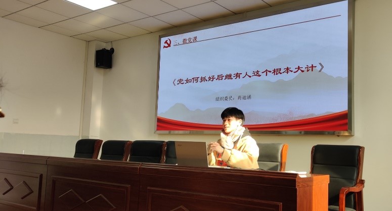 组织委员肖迪涵为大家讲述《党如何抓好后继有人这个根本大计》微党课。他指出,在向第二个百年奋斗目标进军的新征程中,广大青年要读好真理之书、党史之书、时代之书、人民之书,把信仰之基、事业之根、人生之魂牢牢扎在祖国大地上,成为堪当时代重任的接班人。