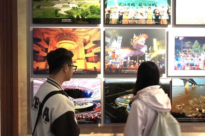 (图为讲解员带领党员同志们观看武汉城市变迁的影片)