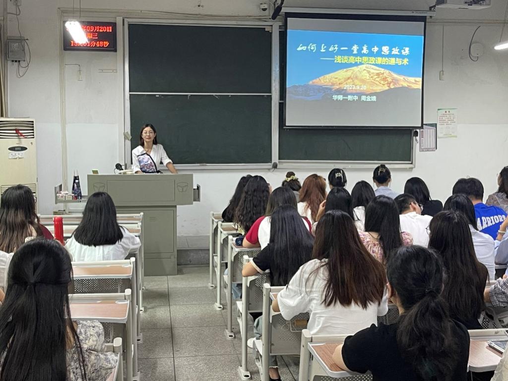 讲座会上,周金娥老师从“好课堂的基本要求”、“‘三新’背景下的教学理念”、“如何设计一节高标准思政课”、“优秀课堂示例”四个方面展开本次讲座。在介绍完一线思政课教师面临的挑战后,周老师对在场同学提出忠告,她表示,一名优秀的高中政治老师需要有坚定的政治方向、与时俱进的学习能力、语言的趣味性和思维的逻辑性,要不断学习充实自己,把教育当作责任担当,培养德智体美劳全面发展的学生。