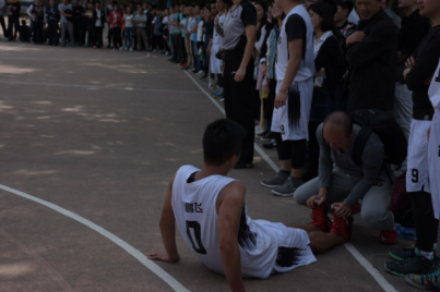同学热烈的呐喊声和加油声中连续进了三个球,给了大家很大程度上的鼓舞,也给对方球队造成很大的压力。对方球队奋起直追,对我方不断变化战术,围追堵截紧咬不放,尤其紧盯我方21号和81号队员,21号徐凡在进攻打不开局面的时候,只能自己持球单打。常规时间最后一个球是0号选手李鹏飞拖进的,拖进加时,生科博士强投三分不中,双方持平,进入加时赛。加时赛角逐更加激烈,但我方出现意外状况,0号队员李鹏飞腿不适退出赛场(右图为徐信华老师给抽筋球员拉筋场景),最后对方以微弱的优势险胜。
