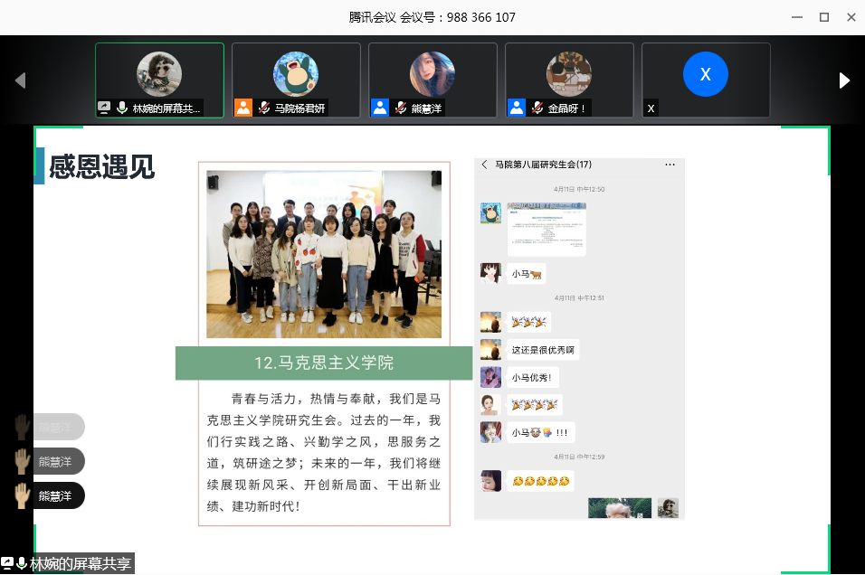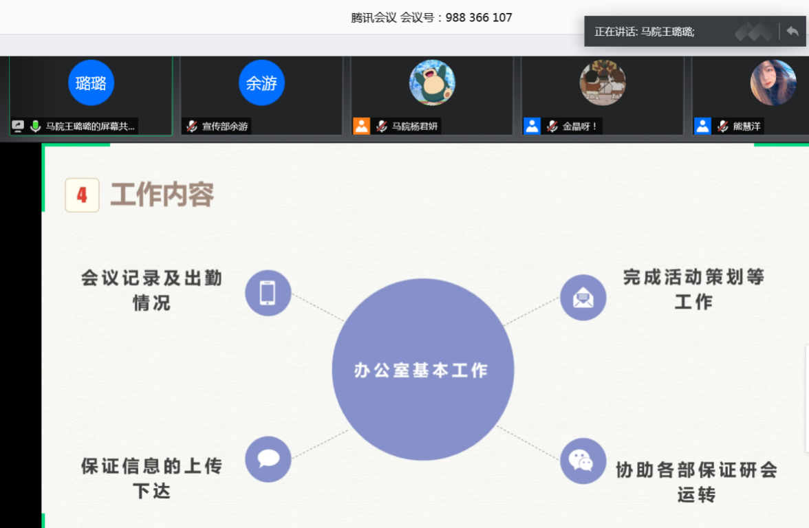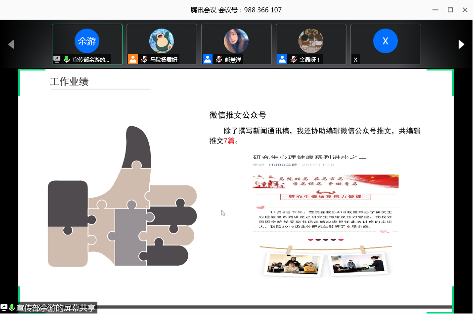 会议第二项议程,由王璐璐、史健桥、李菀、熊罗美婧、李睿、余游、杨瑶和林婉8名同学依次进行个人工作汇报。各汇报人分别从工作态度、工作能力、工作内容和工作业绩四个方面总结自己2019年度研究生会的工作情况。其中,办公室主任王璐璐展示了研会百度云盘文件收录情况、活动及会议考勤记录情况,做好研会工作的痕迹管理;宣传部部长余游围绕多媒体工作开展情况,讲述自己的工作心得,努力打造研会对外的窗口;文体部部员李菀、李睿在汇报中说,从参与研会工作中得到成长,感受到马院一家亲的温暖;学术部部长史健桥致力于策划学术型活动,活跃国产自拍