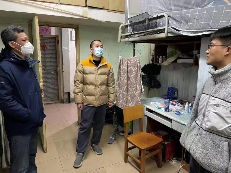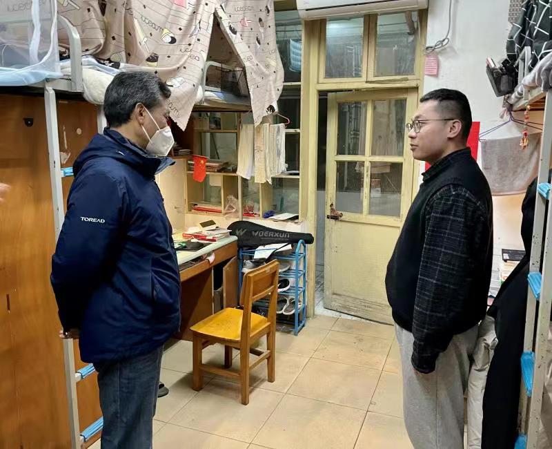 党委书记刘柏林、党委副书记晏妮和辅导员老师邹浩、孙倩深入学生寝室进行卫生安全检查。