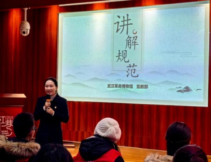 (图为武汉革命博物馆社教老师万小宁为大家做基本情况介绍)