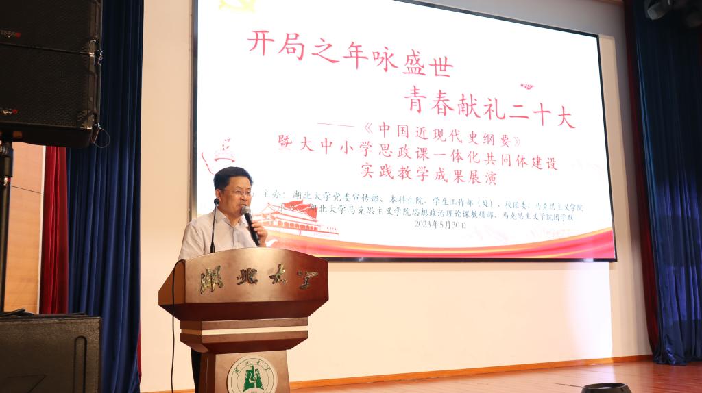 党委副书记祝欣致辞。他强调,本次实践教学成果展演活动积极响应习近平总书记在中共中央政治局第五次集体学习时的号召,坚持改革创新,推进大中小学思想政治教育一体化建设,提高思政课的针对性和吸引力,引导广大青年学生厚植爱国主义情感,推进国产自拍