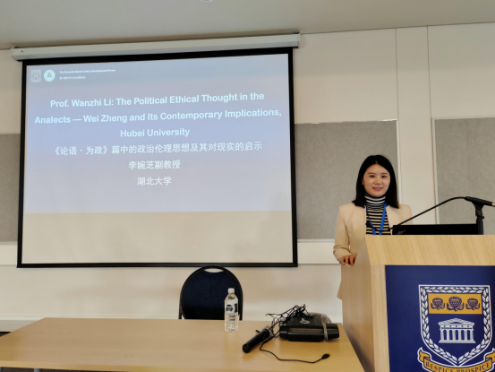 李婉芝副教授作了主题为《<论语·为政篇>中的政治伦理思想及其现实启示》的报告,她认为《论语·为政篇》集中体现了孔子“为政以德”的政治伦理思想,核心内容包括“为政以德”—— 执政者的道德示范是政治伦理的核心,“孝悌为本”—— 家庭伦理是国家政治伦理的延伸,“齐之以礼”—— 社会规范是政治伦理的基础,“以民为本”—— 政治伦理的根本指向是百姓福祉四大核心维度。这些思想有助于将传统政治伦理的智慧转化为当代社会发展的“精神养分”,对推进国家治理体系和治理能力现代化具有重要启示,要重视德治与法治的双重作用,重视礼治在社会规范方面的现代转化,坚持人民至上的价值导向,加强新时代中国特色政治伦理建设。