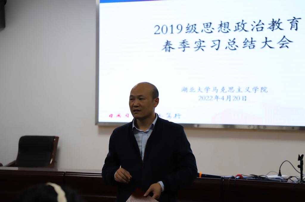 在410报告厅举行实习总结大会,副院长徐信华、郭劲松、张楷、胡银银、杨海军、翟艳芳等指导教师代表以及思想政治教育专业2019级全体同学参加,政教系副主任胡银银主持会议。