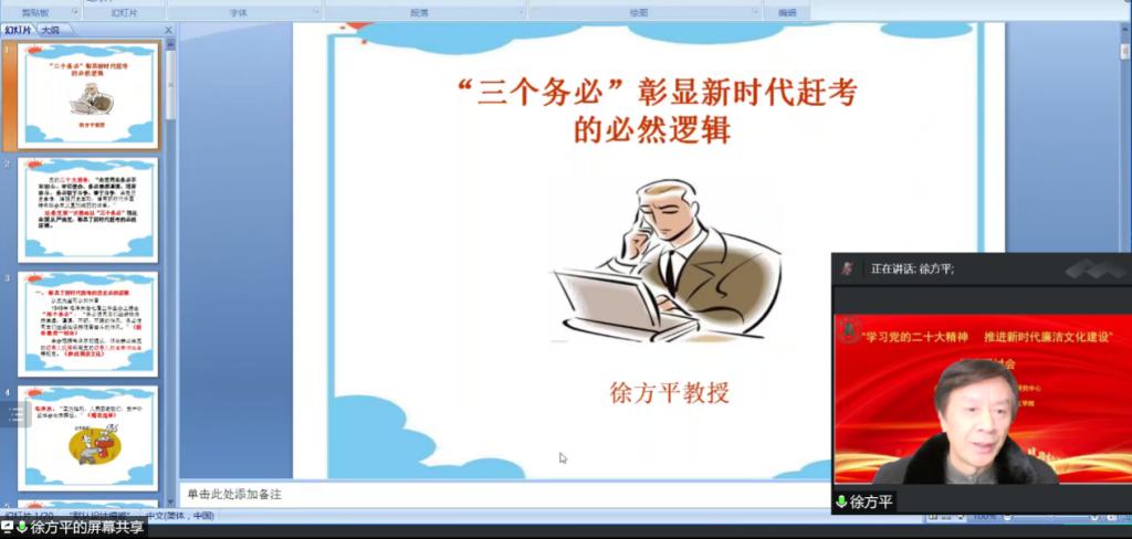 徐方平教授围绕历史必然逻辑、现实必然逻辑和理论必然逻辑三个方面,以《“三个务必”彰显新时代赶考的必然逻辑》为题作了精彩发言。他提出,“三个务必”是对“两个务必”的一脉相承又与时俱进,是党为了努力完成第二个百年奋斗目标的赶考使命,发扬历史主动精神提出的重要论断,也是深刻把握世界百年未有之大变局的智慧结晶。“三个务必”是相辅相成的理论逻辑整体。第一个“务必”是对党的宗旨生动而深刻的概括,是第二和第三个“务必”一以贯之的出发点和归宿点。第一和第二个“务必”侧重对全体党员的理想信念教育和作风教育。第三个“务必”侧重加强全党的责任担当。同时,他分析了“三个务必”与“三个不”之间的关系,指出要坚持不敢腐、不能腐、不想腐一体推进,同时发力、同向发力、综合发力。