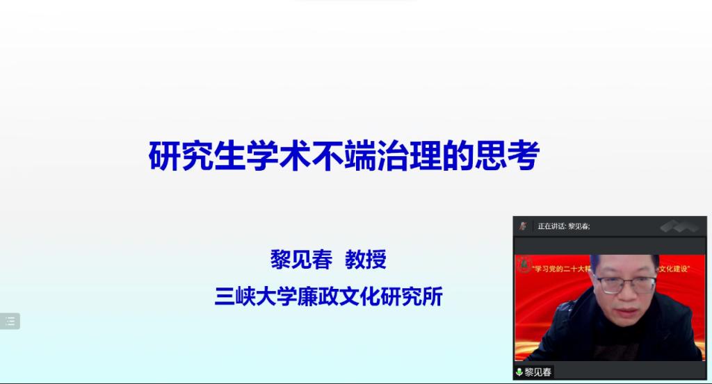 黎见春教授以《研究生学术不端行为治理思考》为题,指出当前高校学术不端频发,凸显了加强高校廉洁文化建设的极端重要性。他列举出研究生学术不端行为的六种表现,分析了研究生产生学术不端行为的主观因素、客观因素和现实困扰,同时从学术道德的培养与科学精神的养成、规范研究生培养过程和严格质量监控、尊重学术研究和学术成长的规律、建立健全学术监管体系、打造风清气正的学术生态、严格执行学籍、学位管理的学术规范六个方面提出了治理学术不端行为的举措。