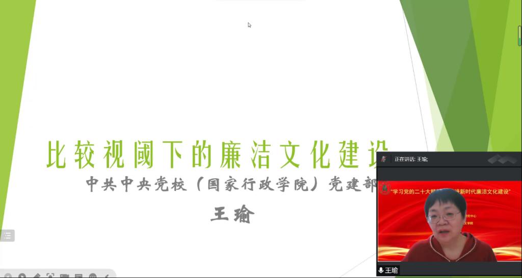 王瑜教授以《比较视域下的廉洁文化建设》为题,系统梳理了习近平总书记关于廉洁文化建设的重要论述,分析了“廉政”到“廉洁”的变化,并从三个方面阐释了加强新时代廉洁文化建设的重要意义,最后将中国共产党与新加坡人民行动党的廉洁文化建设进行比较分析,指出两党最大的相似之处是长期执政,分别从两党在腐败分子的惩治力度、廉洁文化建设内容、廉洁建设的制度保障三个方面进行比较,观点新颖,视角独特。