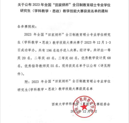 12月3日,2023年全国“田家炳杯”全日制教育硕士(学科教学 思政)专业教学技能大赛决赛结果出炉,在国产自拍