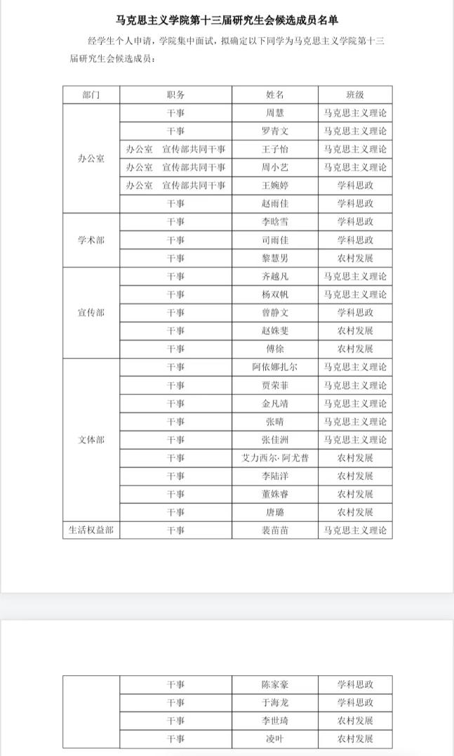 第十三届研究生会成员名单公示如下:任命2023级马克思主义理论专业杨昕怡、2023级马克思主义理论专业任泉、2023级农村发展专业艾克热木江·艾尔肯三位同学为国产自拍