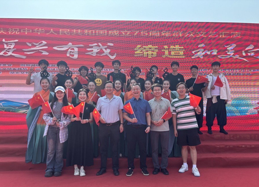 在校党委宣传部和团委的协调支持下,我校大学生文化艺术中心师生参加了向阳湖镇“强国复兴有我 缔造和美向阳”庆祝中华人民共和国成立75周年群众文艺汇演。师生们精心筹备、倾情演绎的精彩舞蹈《大河之子》与《橘颂》不仅展现了湖大学子深厚的艺术功底,更深刻传达了中华文化的独特韵味,赢得了当地干部群众的一致好评。