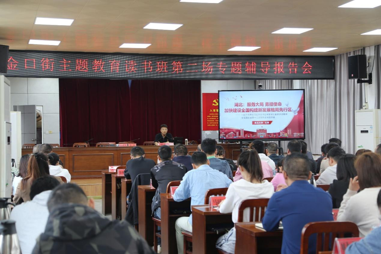易振龙教授、王昊博士分别为江夏区金口街道主题教育读书班作理论报告。金口街道党工委班子成员、村(社区)书记、后备干部200余人参与报告会。